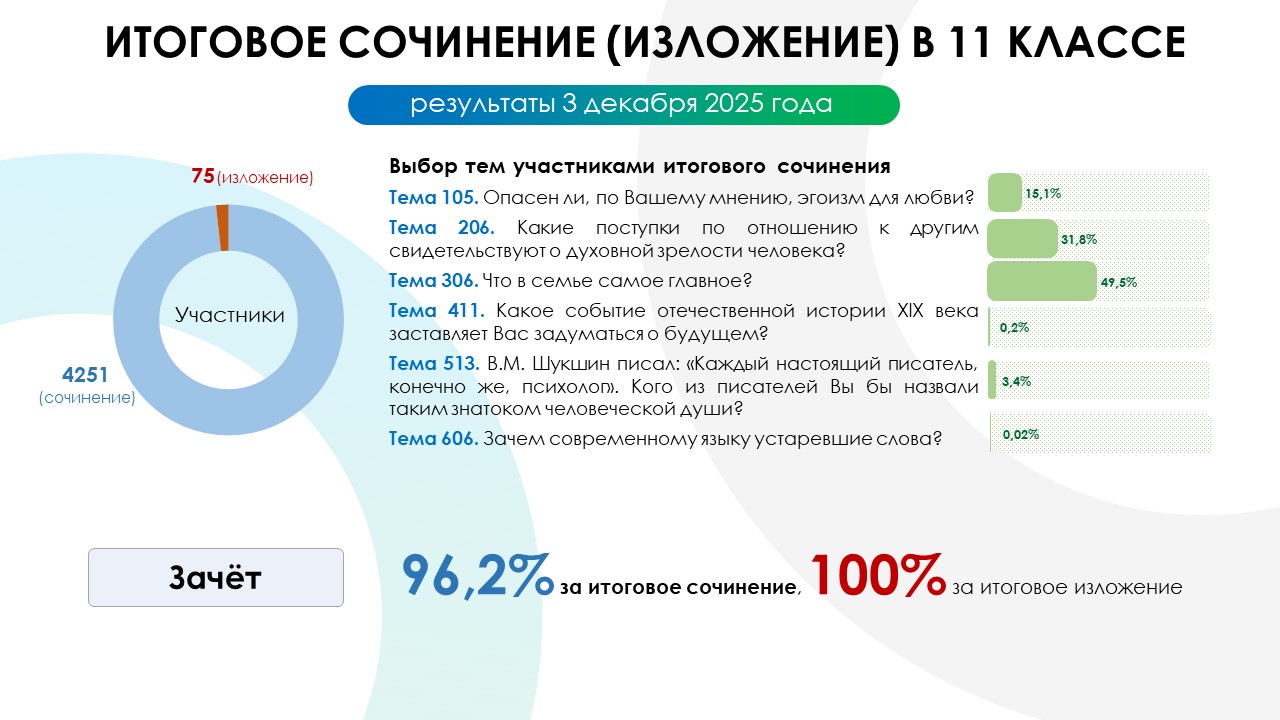 В Липецкой области итоговое сочинение в основной день 3 декабря 2025 года успешно написали 96,2 % выпускников, принимавших в нем участие. Всего в этот день сочинение писали 4251 человек.